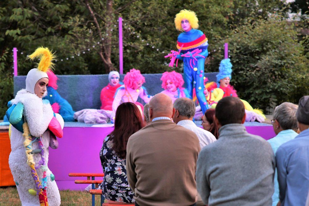 Es funktioniert, wegen der Ironie, mit der Ponader seinen Text auflädt, wegen des begeisternden Spiels der Darsteller, auch wegen der reizvollen Parkumgebung. Und im Laufe der Aufführung hat sich das Publikum vergrößert, Spaziergänger, Erholungssuchende, spielende Kinder sind stehen geblieben und schauen zu. Hier passiert was Interessantes – nicht die schlechteste Wirkung, die Theater haben kann.