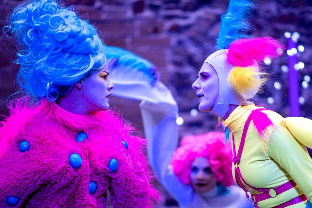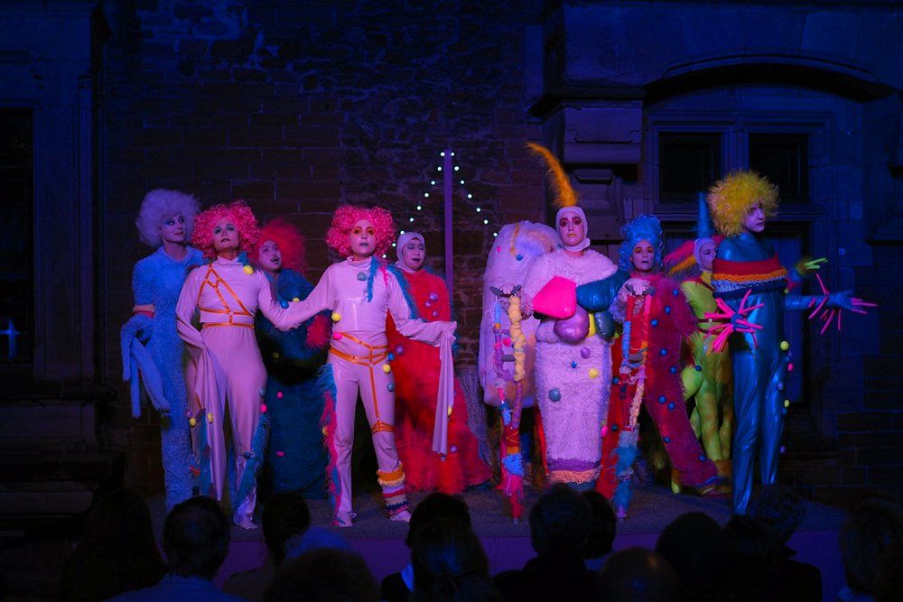 Zehn sehr wundersame Wesen wie aus einem surrealen Traum, mit bunten, phantasievollen Körperkreationen jenseits aller Normen, spielen, singen und tanzen sich durch die prominenteste Sommernacht der Weltliteratur. Ein riesiges Bett ist ihre Bühne, auf der sie mit Acapella-Musik von Barock bis neuen Songs Skakespeares genial-visionäre Traumwelt als eine große, exzentrische Zeremonie aller Spielarten der Liebe: diese vielschichtigen Geschichten im Wald bei Athen kurz vor dem Hochzeitsfest von Theseus und Hippolyta, wo die zwei jungen athenischen Paare in einem Zustand zwischen Traum und Verzauberung von der Magie des Feenreiches in ihren Liebesverwirrungen noch verwirrter gemacht werden – um schließlich nach diesem sinneläuternden Wahn-Sinns-Trip mit dem athenischen Königspaar gemeinsam den heiligsten Bund zwischen Menschen, die Ehe, einzugehen. Dem sich am Ende auch das Königspaar der Feenwelt, Titania und Oberon, für ihr persönliches Versöhnungsfest anschließen. Das ganze Publikum ist zu der Feierlichkeit eingeladen: Bei Speis und Trank und allerlei Lustbarkeiten klingt ein unvergessliches Zauberspiel aus.